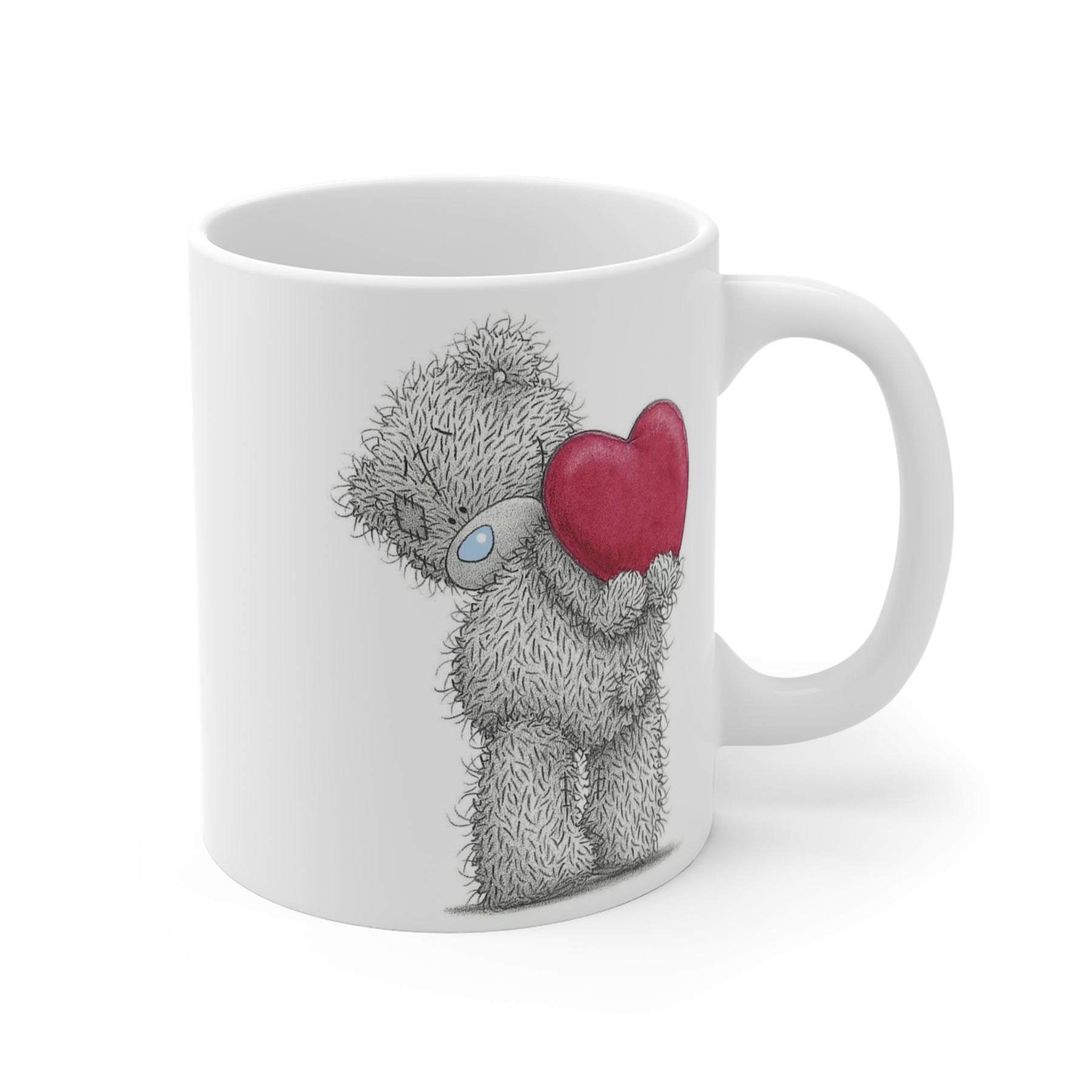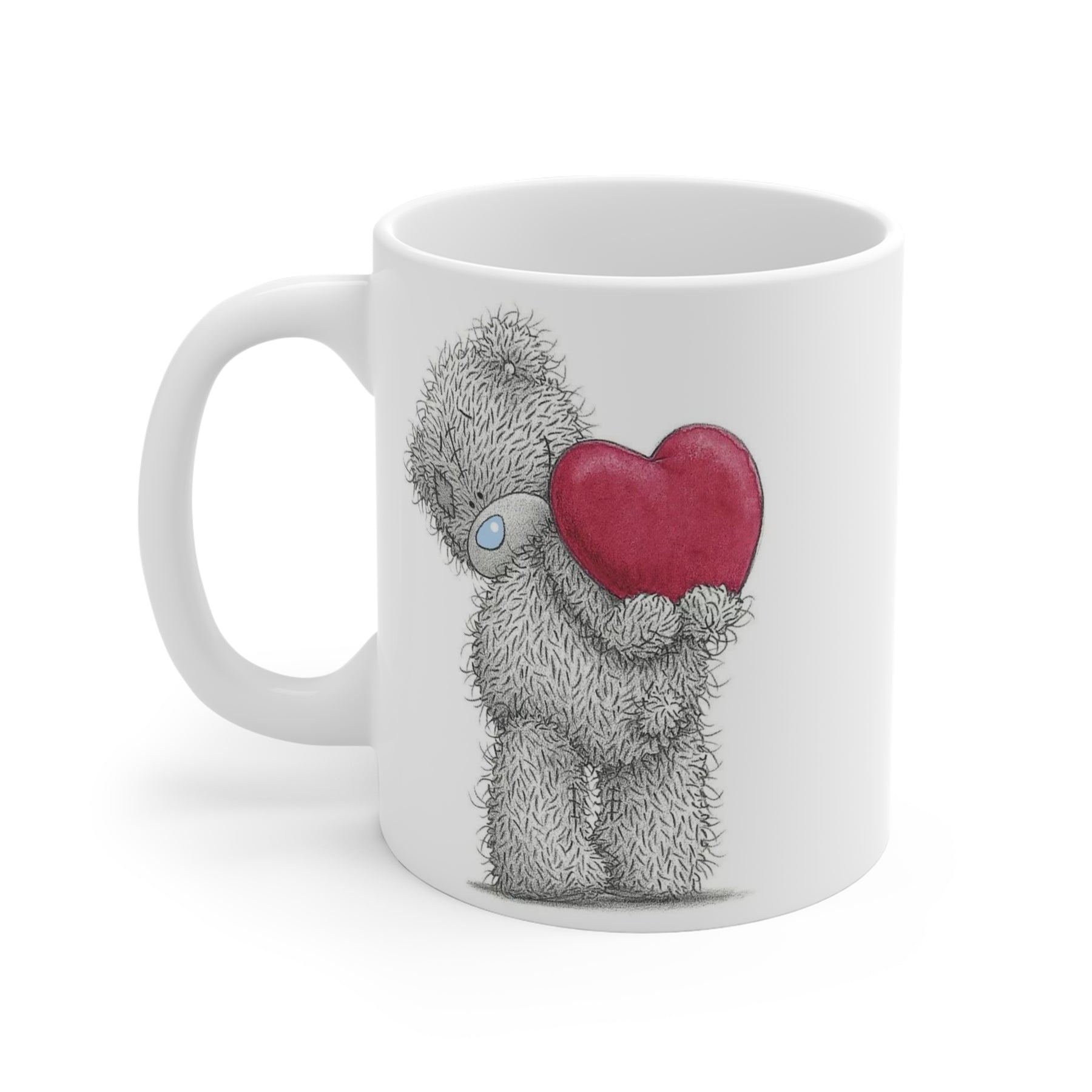 This 11 oz white ceramic mug features a soft, hand-drawn illustration of a grey teddy bear holding a red heart ❤️—a gentle design that brings warmth and quiet joy to your day. Perfect for slow mornings, cozy evenings, or a calm pause between busy moments.