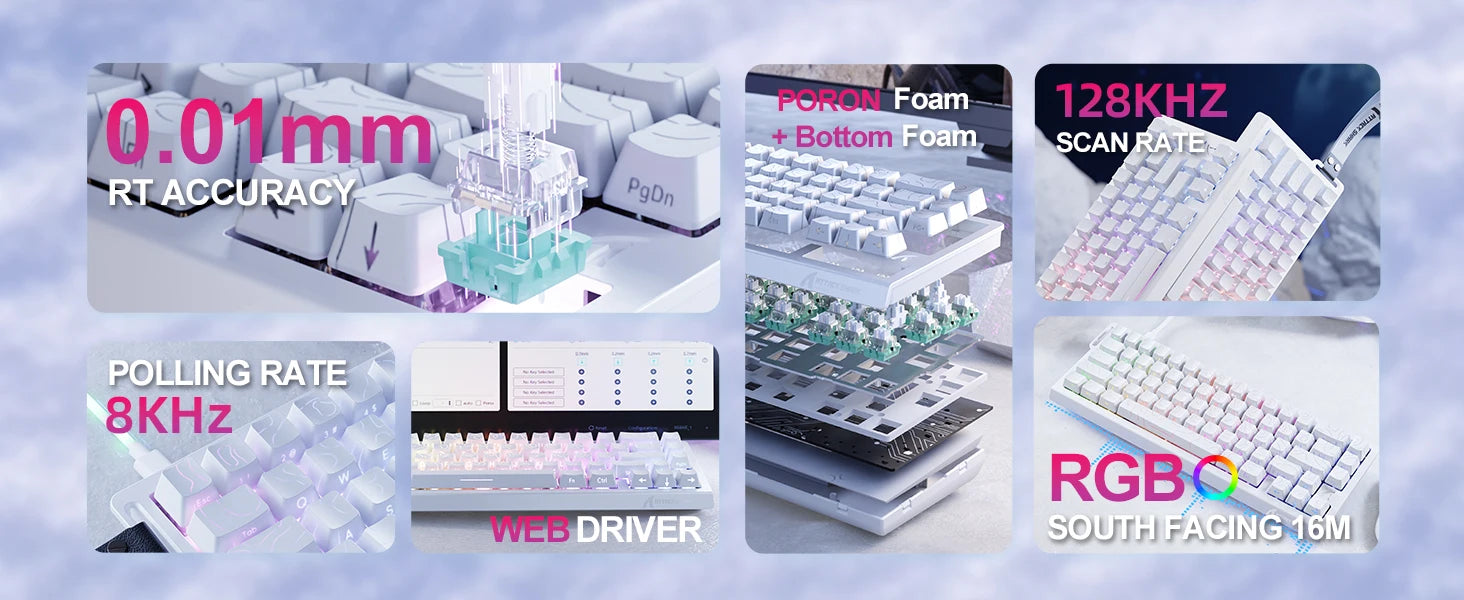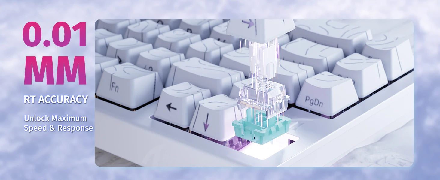 Hall Effect Magnetic Switches: Hot-swappable and adjustable from 0.1mm to 3.4mm for precise, rapid-trigger keystrokes. Bind up to 4 functions per key for complex commands.